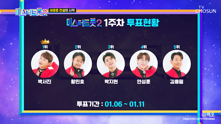 | 미스터트롯2 [4회] 온라인 '1주차 투표현황' 1위 박서진 2위 황민호 3위 박지현 4위... (0) | 2023.01.14 |